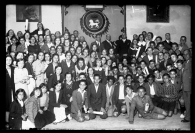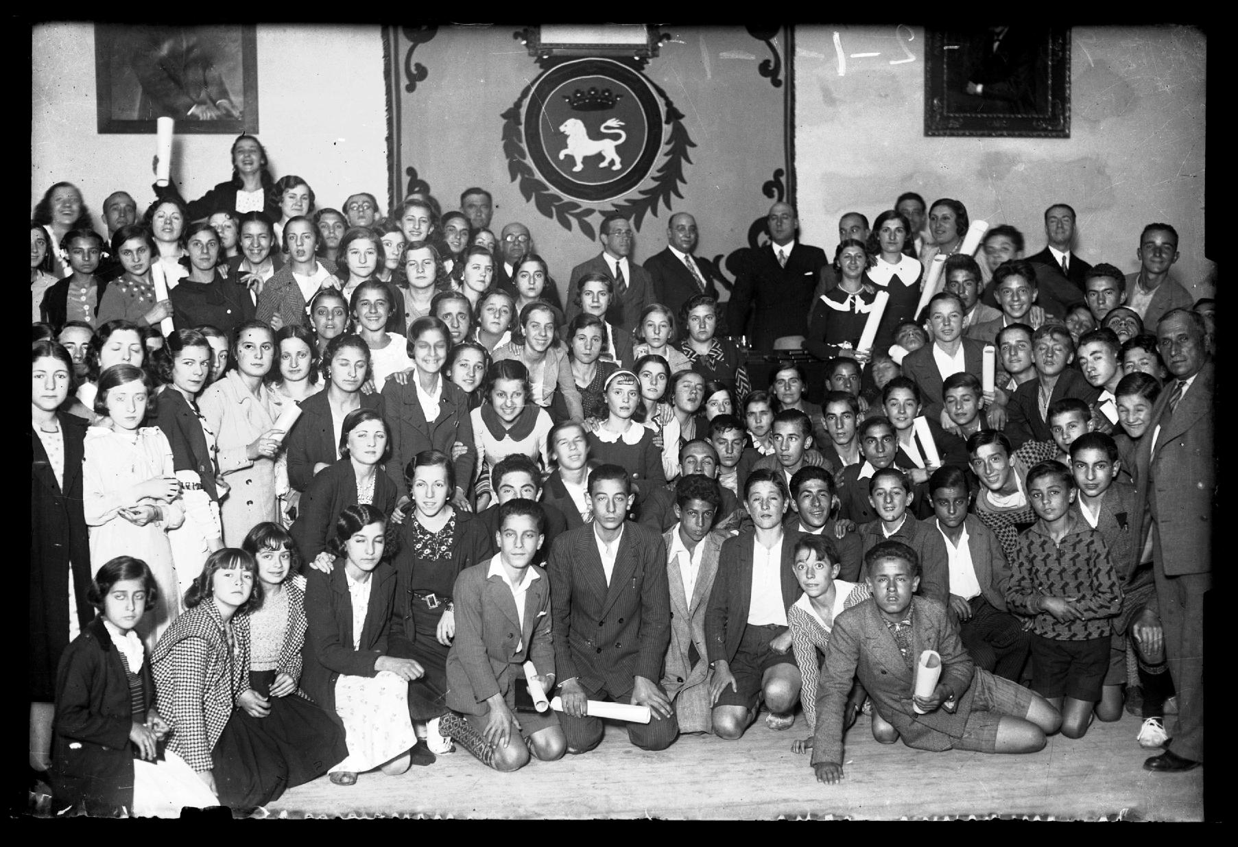 Retrato colectivo de un grupo numeroso de jóvenes escolares asistentes a un acto organizado por el Ayuntamiento de Pamplona.