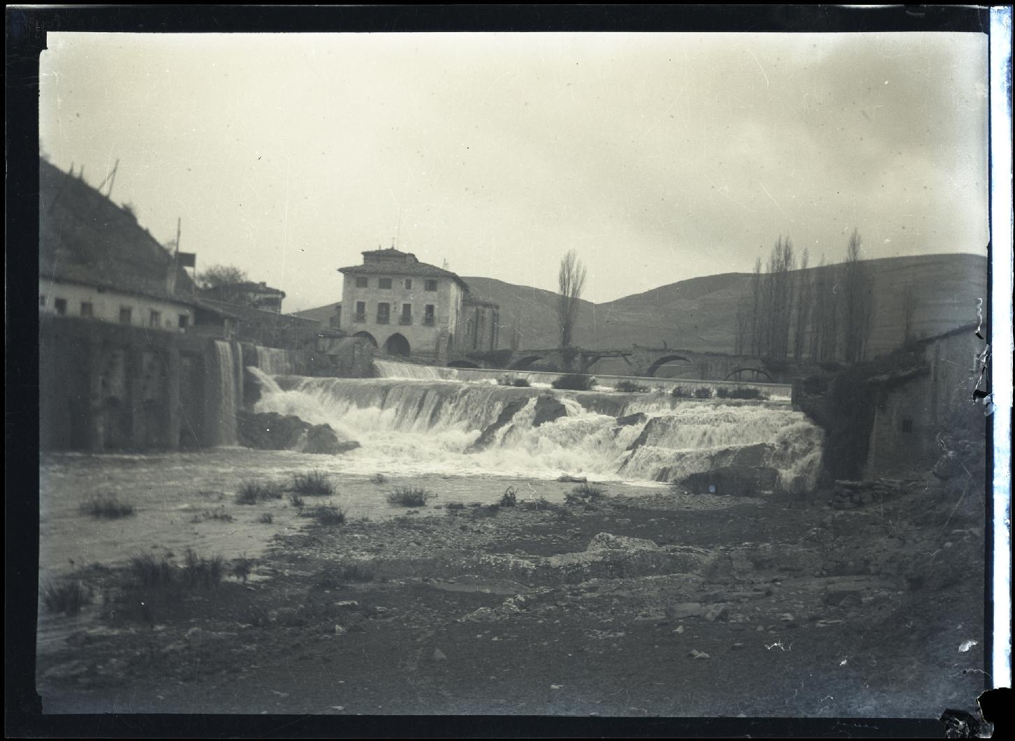 Vista general de la basílica, el puente y la presa de la Trinidad en Arre, en el valle de Ezcabarte, tomado desde la margen izquierda del río Ulzama aguas abajo, en el término municipal de Villava. En primer término, el salto natural del río. Al fondo, casa y ábside del templo y la estructura de piedra del puente.