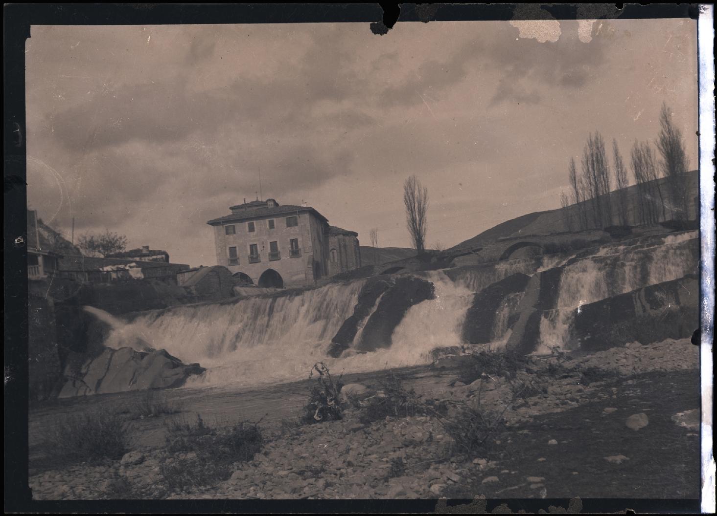 Vista general de la basílica, el puente y la presa de la Trinidad en Arre, en el valle de Ezcabarte, tomado desde la margen izquierda del río Ulzama aguas abajo, al oeste, en el término municipal de Villava. A la izquierda, el salto natural del río. En segundo plano, la casa y ábside del templo y la estructura de piedra del puente.