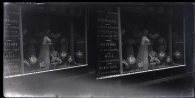 Vista de un escaparate de un comercio de encajes manufacturados en una localidad de Francia, posiblemente París. En primer término, el escaparate con un maniquí con vestido de encaje y varios bustos con cuellos de puntillas. En la parte inferior, un rótulo en el que se puede leer: FACTURE ROYALE DE DENTELLES, y en el cristal: MAN SPRICHT DEUTSCH. En la izquierda un rótulo: "(...) ÉMES MAISONS A BRUXELLES - PLACE DE BROUCKERE. 3 GALERIE DU ROI. 9 GALERIE DU ROI - OSTENDE 41ª DIGUE DE MER - NICE 18 AVENUE MASSENA - MONTE CARL 5 GALERIES CHARLES II"