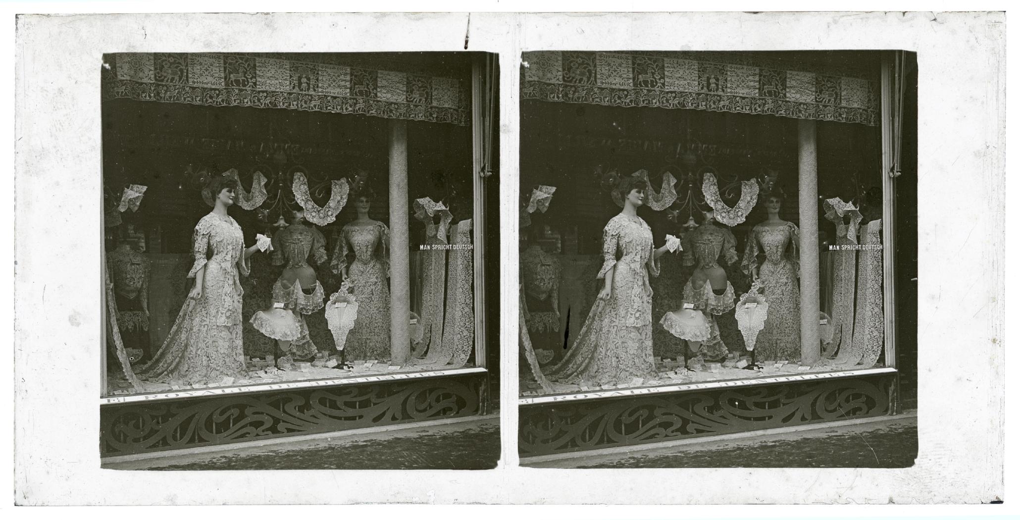 • Contenido: Vista de un escaparate de un comercio de encajes manufacturados en una localidad de Francia, posiblemente París. En primer término, el escaparate con 2 maniquíes con vestidos de encaje y varios bustos con cuellos de puntillas. En la parte inferior, un rótulo en el que se puede leer: ROYALE DE DENTELLES, en el cristal: MAN SPRICHT DEUTSCH y, debajo, una decoración de estilo modernista.