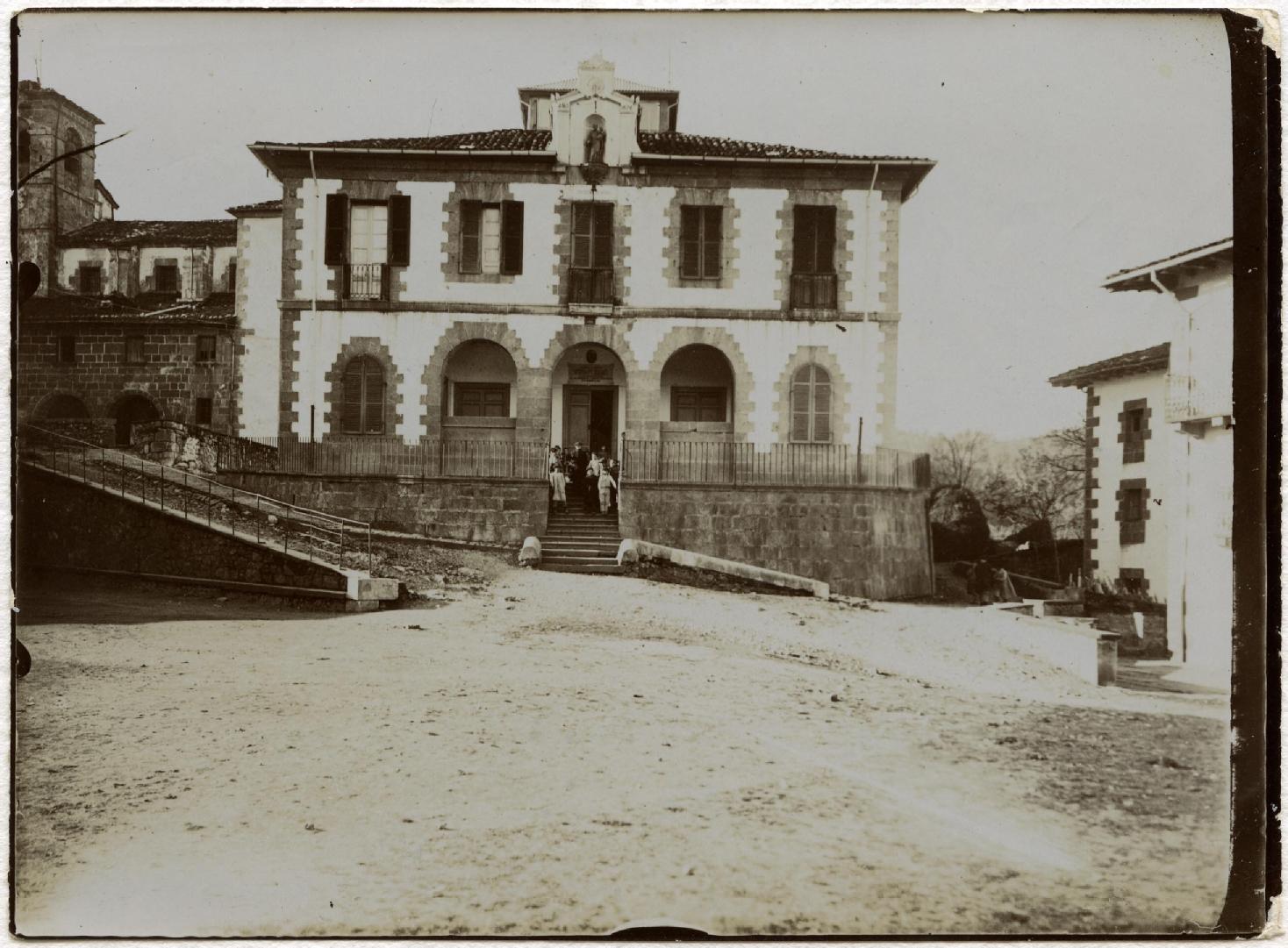 Vista de la fachada de las escuelas de la localidad de Huici en el municipio de Larraun, Navarra, tomada desde el este. En la escalera, un grupo de niños.