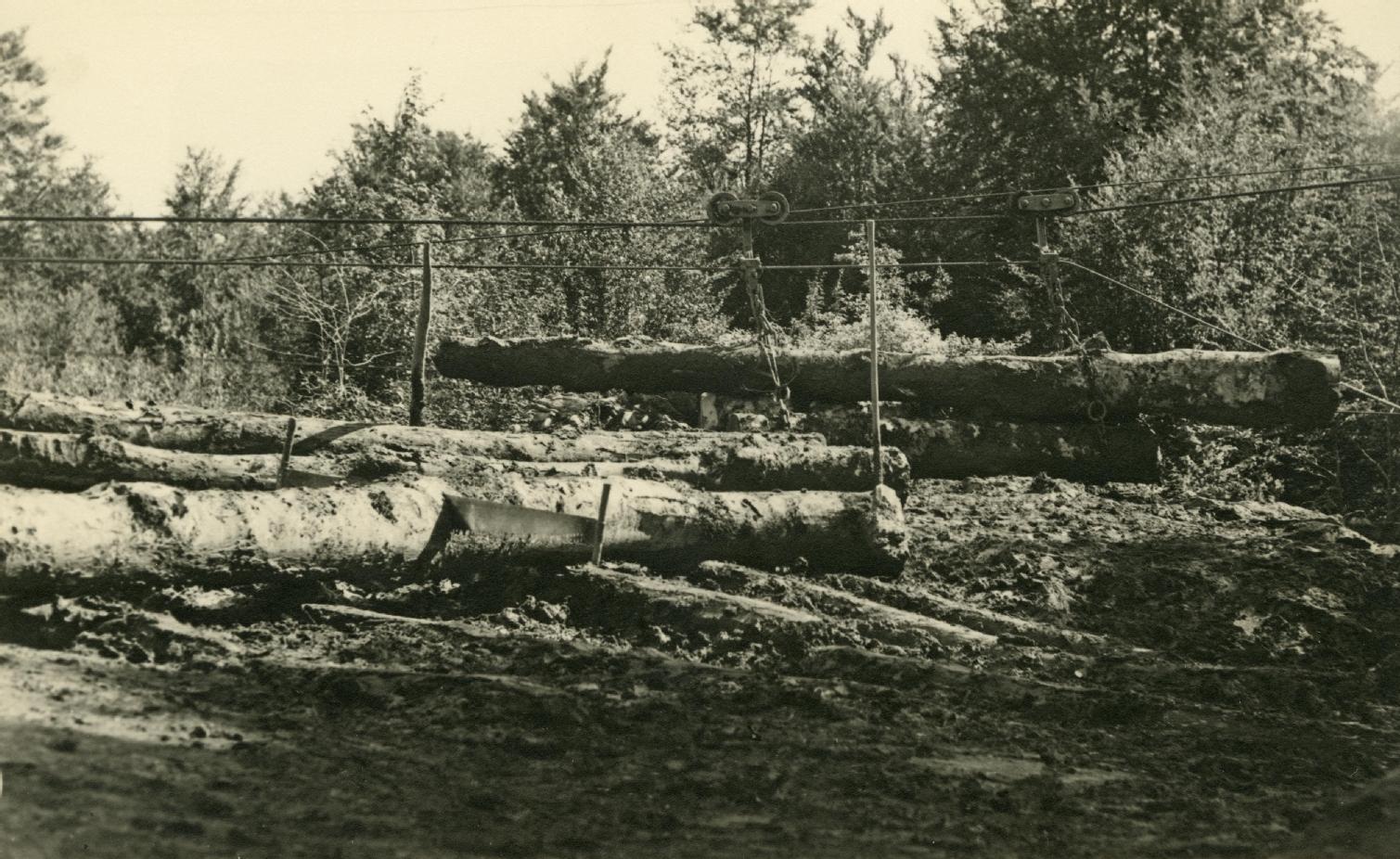 Estación de descarga de un teleférico tricable. Acopio de troncos.