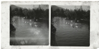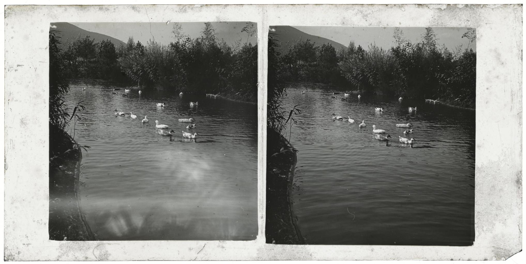 Vista del estanque de los jardines del Señorío de Bertiz en Oyeregui, municipio de Bertizarana, con un numeroso grupo de patos nadando en el agua. Al fondo, el monte.