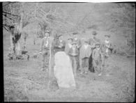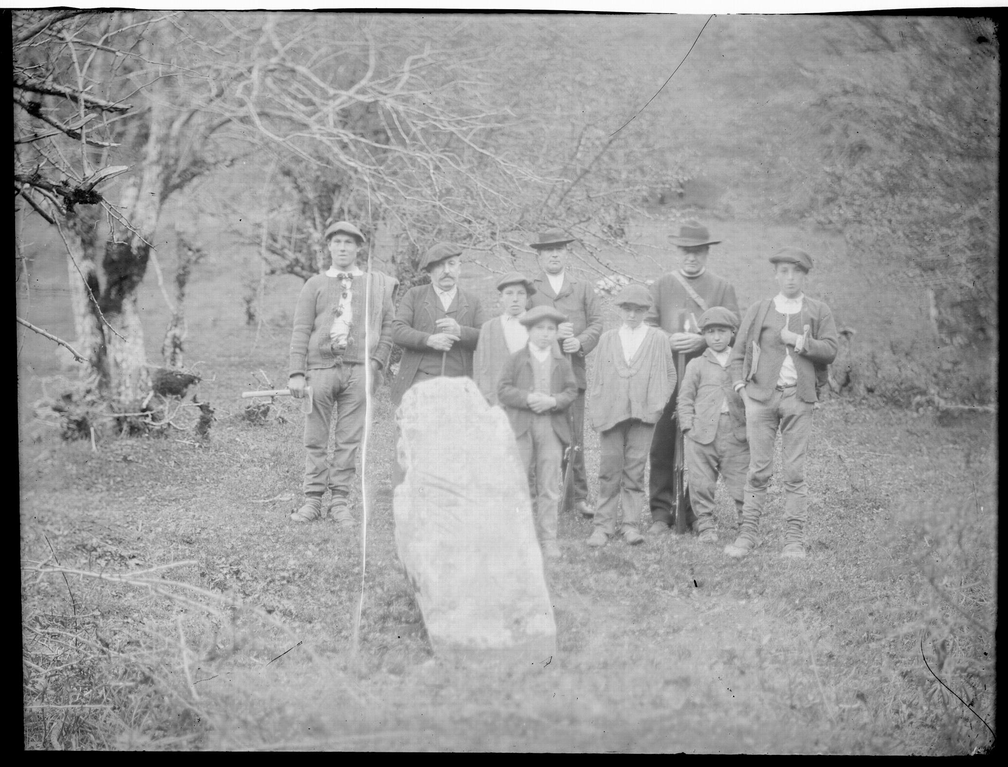 Retrato colectivo de un grupo de excursionistas ante el menhir de Ata en la estación dolménica de la sierra de Aralar, en Huarte Araquil, también conocido como Erroldan Harria o piedra de Roldán. Tras el monumento megalítico, en pie, 3 hombres, 5 niños y un sacerdote con sotana.