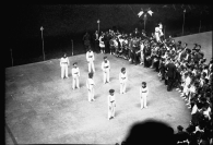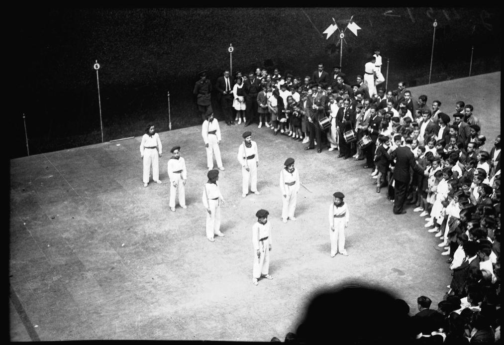 Instantánea de la exhibición de un grupo de niños dantzaris celebrada en el frontón Euskal Jai en Pamplona, tomada al inicio del baile de un paloteado desde la tribuna con los dantzaris en formación sobre la cancha.