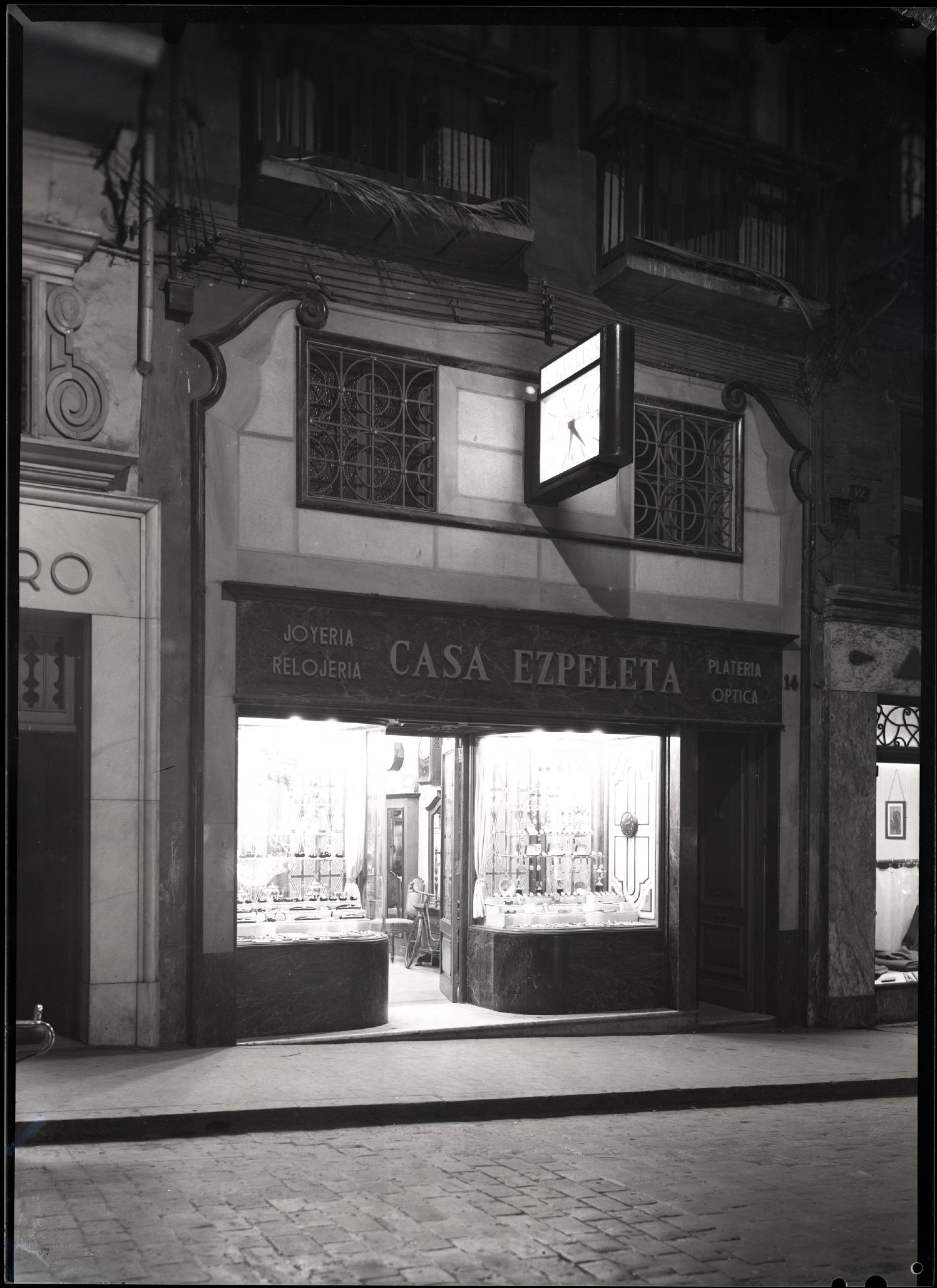 Vista de la fachada del local comercial de joyería, relojería, platería y óptica Ezpeleta en la calle Chapitela, número 6, de Pamplona. Sobre el escaparate: "CASA EZPELETA".