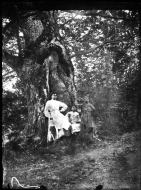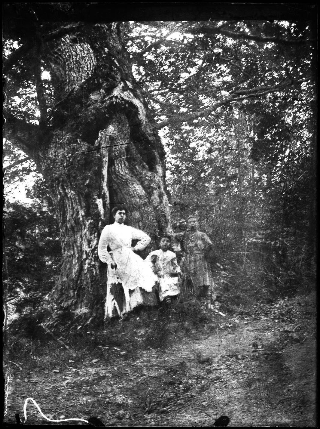 Retrato en plano entero de 3 miembros de la familia Erro Yaben junto a un roble en el bosque de Esáin, municipio de Anue. En el centro de la imagen, de pie, una mujer con sombrilla y 2 niños delate del árbol.