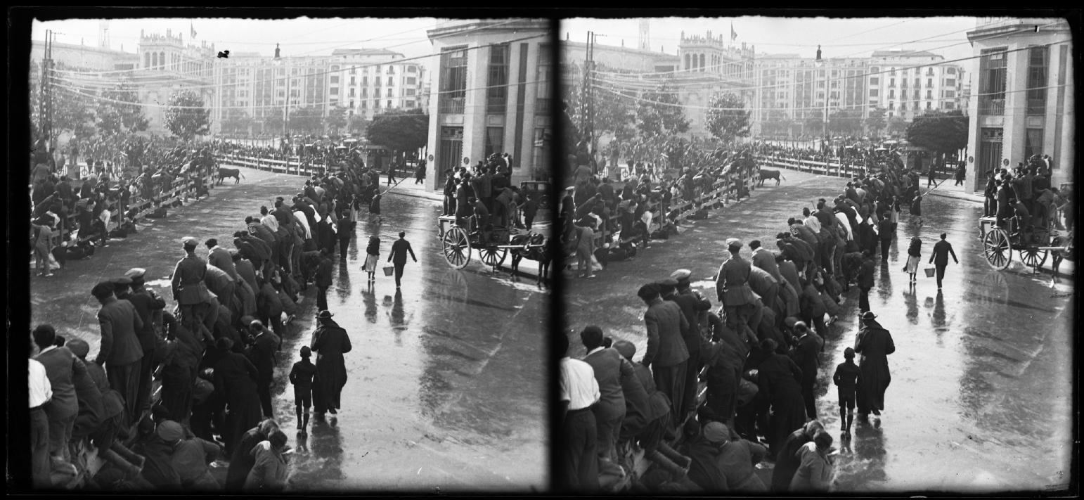 Las casas de la calle Emilio Arrieta se levantaron entre 1930 y 1933. Caja original 19. Manuscrito en una etiqueta: "19. SAN FERMIN / ENCIERRO". En el sobre original, manuscrito: "102". Degradación de tipo físico: pérdidas de gelatina, rayas, manchas y huellas digitales en la capa de emulsión. Deterioros químicos: espejeo en lo bordes.