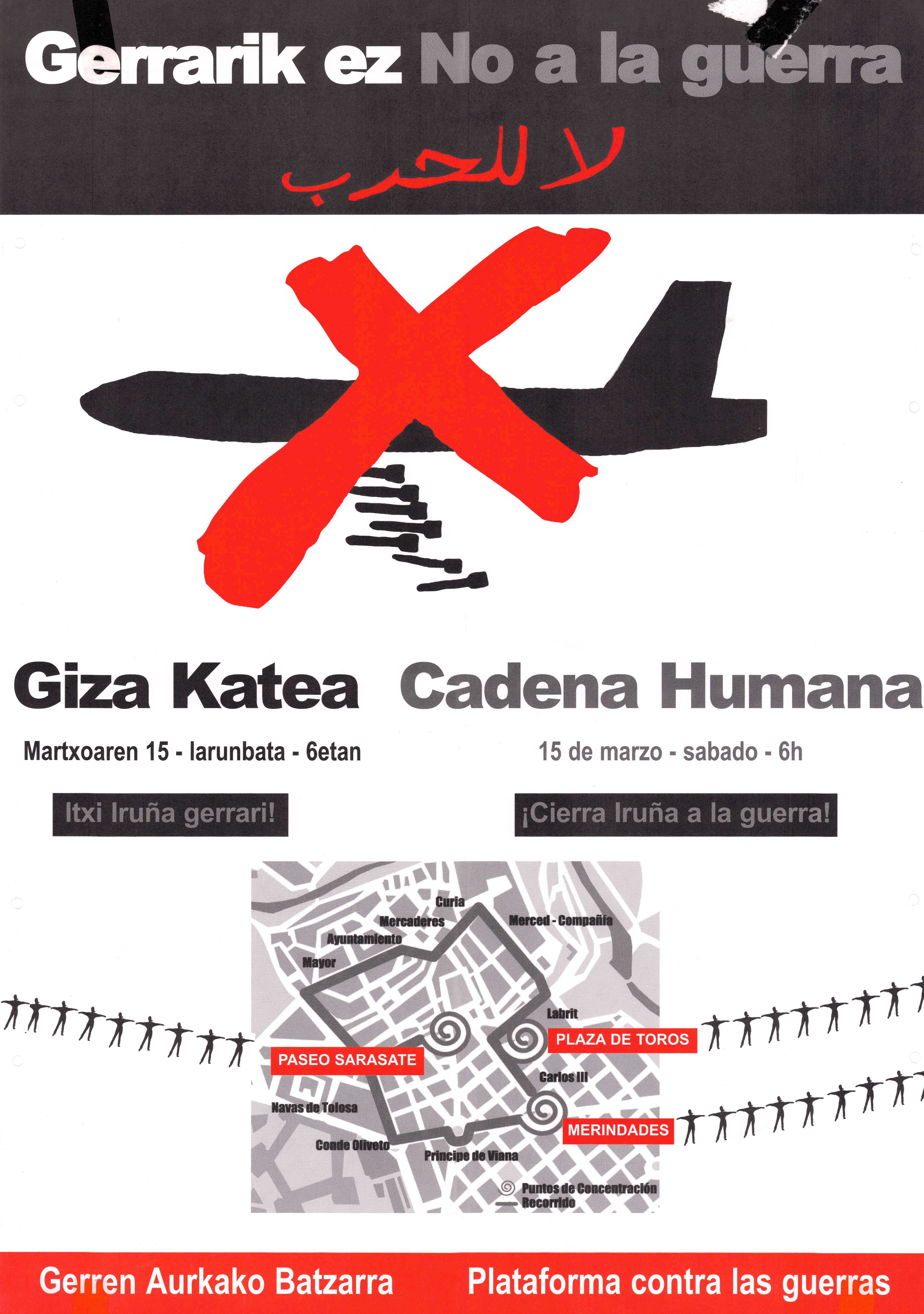 Cartel en euskera, castellano y árabe que anuncia una cadena humana el 15 de marzo a las 18:00 horas que pase por Paseo Sarasate, merindades y la Plaza de Toros. El cartel muestra el mapa de la cadena humana. La movilización se realiza bajo el lema No a la guerra. El cartel es probablemente de 2001 o 2003, año de la campaña conrta la guerra motivada por la invasión de Afganistán e Irak. La movilización está convocada por la Plataforma contra las guerras. El cartel lleva un fondo blanco y un avión militar tachado en rojo.