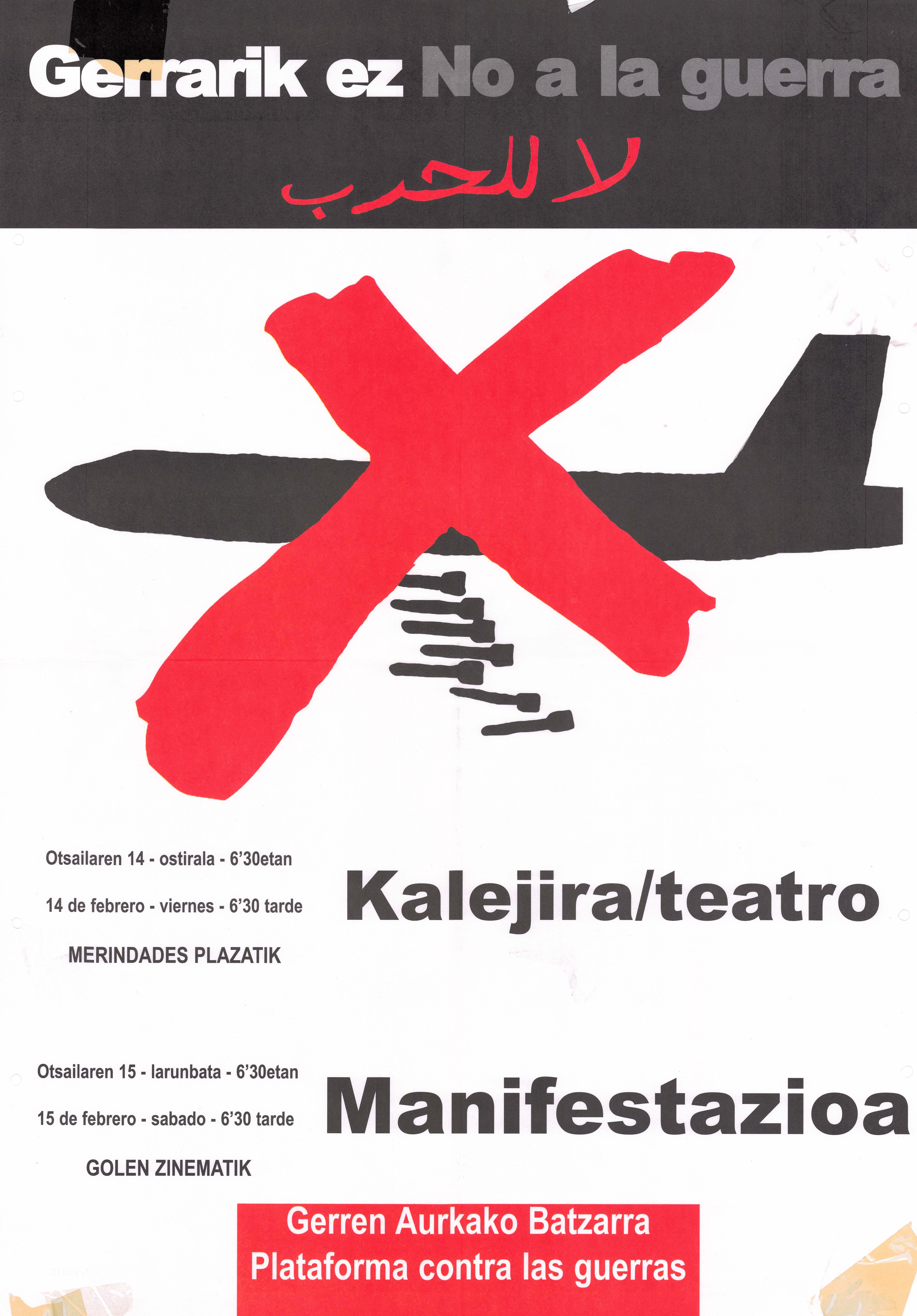 Cartel en euskera, castellano y árabe que anuncia una kalejira (14 de febrero de 2003, desde Merindades a las 18:30 horas) y una manifestación (el 15 de febrero, desde los Golem a las 18:30) bajo el lema No a la guerra. El cartel es probablemente de 2001 o 2003, año de la campaña contra la guerra motivada por la invasión de Afganistán e Irak. La movilización está convocada por la Plataforma contra las guerras. El cartel lleva un fondo blanco y un avión militar tachado en rojo.