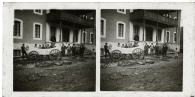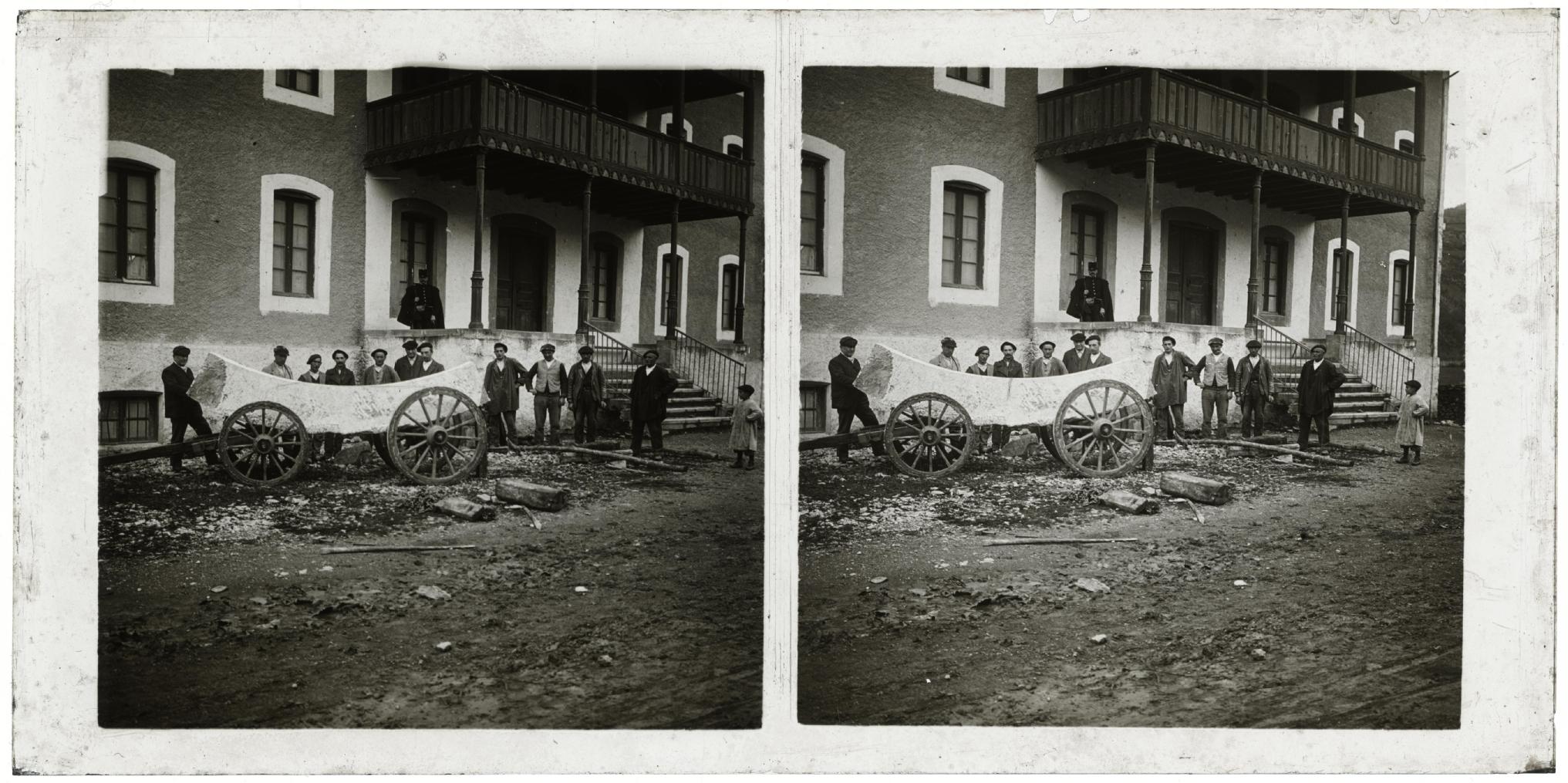 Vista de un grupo de 12 hombres y un niño con una gran piedra sobre un carro en la fachada de la casa Ochocotonea en Mugaire, junto a la entrada al Señorío de Bertiz.