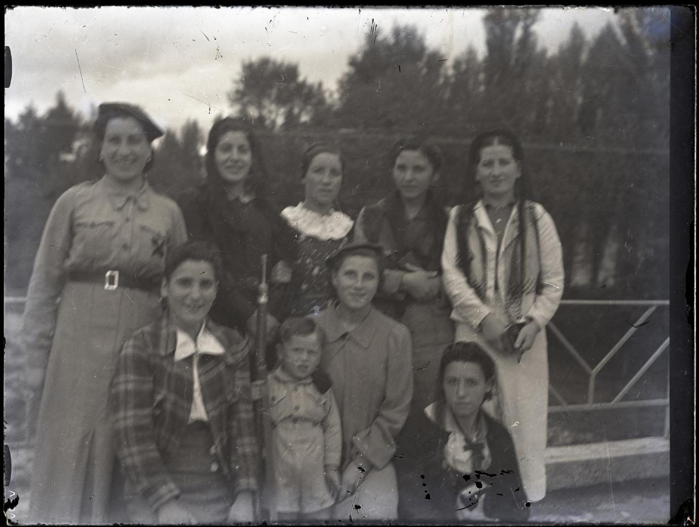 Retrato en plano americano de 8 "Margaritas" con un niño en el campo, en el puente de San Andrés sobre el río Ulzama en la localidad de Villava, Navarra. El niño, de uniforme, con un fusil de juguete; una de las mujeres con uniforme carlista y otras 4 con la cabeza cubierta con una mantilla.