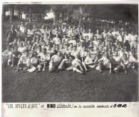Retrato en plano entero de un numeroso grupo de hombres, miembros de la Asociación Musical de Los Amigos del Arte de Pamplona, en un prado, algunos de ellos con instrumentos, durante una excursión a la localidad de Iribas en el municipio de Larraun.