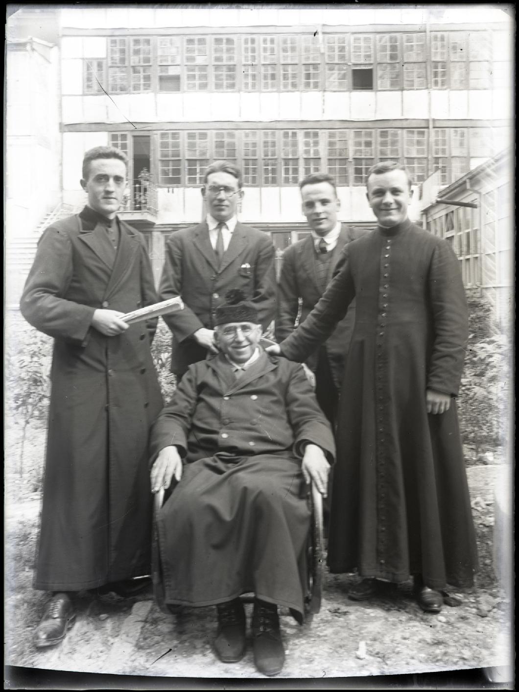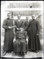 • Contenido: Retrato en plano entero de 5 hombres en un patio. En el centro, un sacerdote con bonete y dulleta sentado en una silla, a ambos lados, un sacerdote joven y, detrás, dos hombres jovenes con traje. Al fondo, un edificio con galerías.