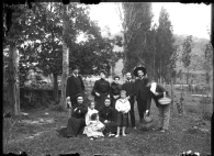 Retrato en plano entero de un grupo de 4 hombres, 4 mujeres y 3 niños en el campo. En pie, en el centro de la imagen, Florencia Aldave Artega.