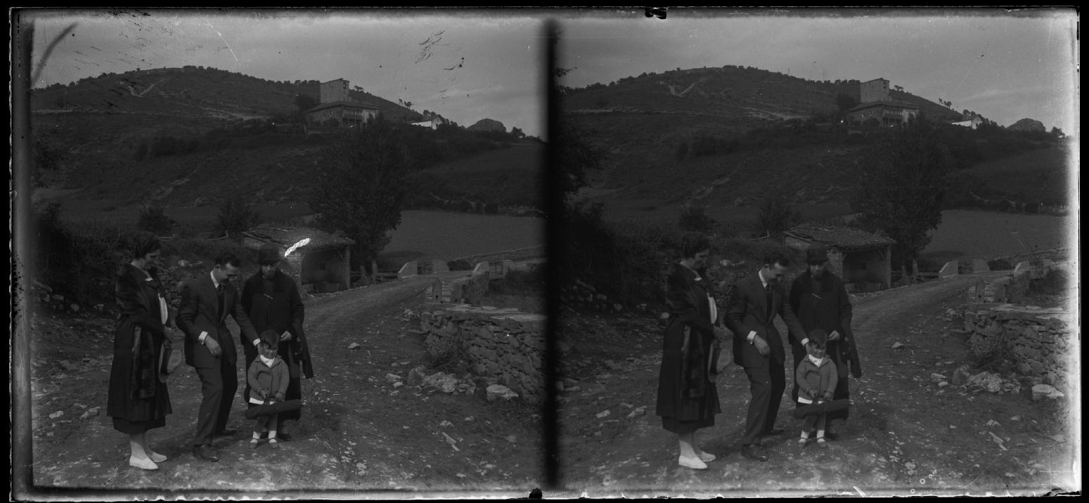 Escena familiar en la carretera de Esáin, junto al fuente de abajo. En primer término, Margarita Amat, Carlos Amat y Juana Erro junto a Patxi Oficialdegui; en segundo plano, la fuente con el abrevadero y, al fondo, la iglesia de San Juan Bautista.