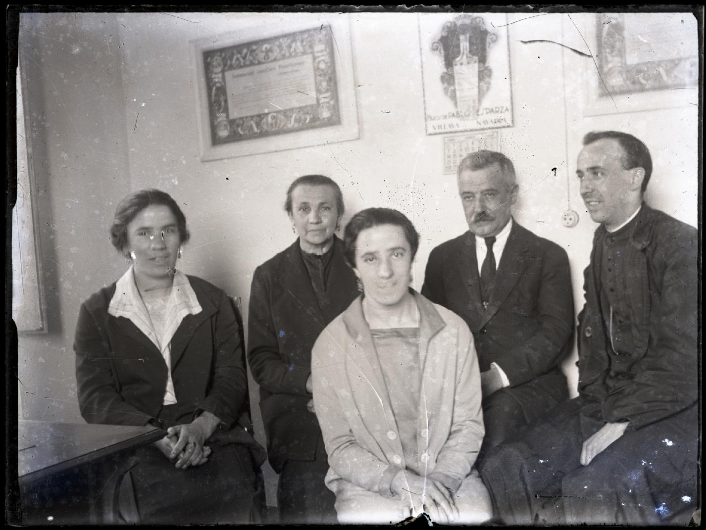 • Contenido: Retrato en plano medio un grupo compuesto por 3 mujeres y 2 hombres en una habitación con un calendario de anís "HIJOS DE PABLO ESPARZA / VILLAVA - NAVARRA"