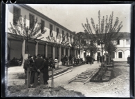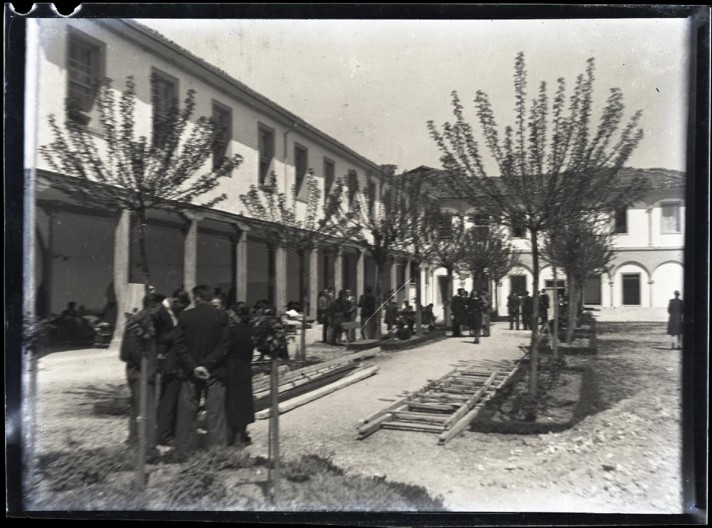 • Contenido: Vista de un patio ajardinado en obras con varios grupos de personas.