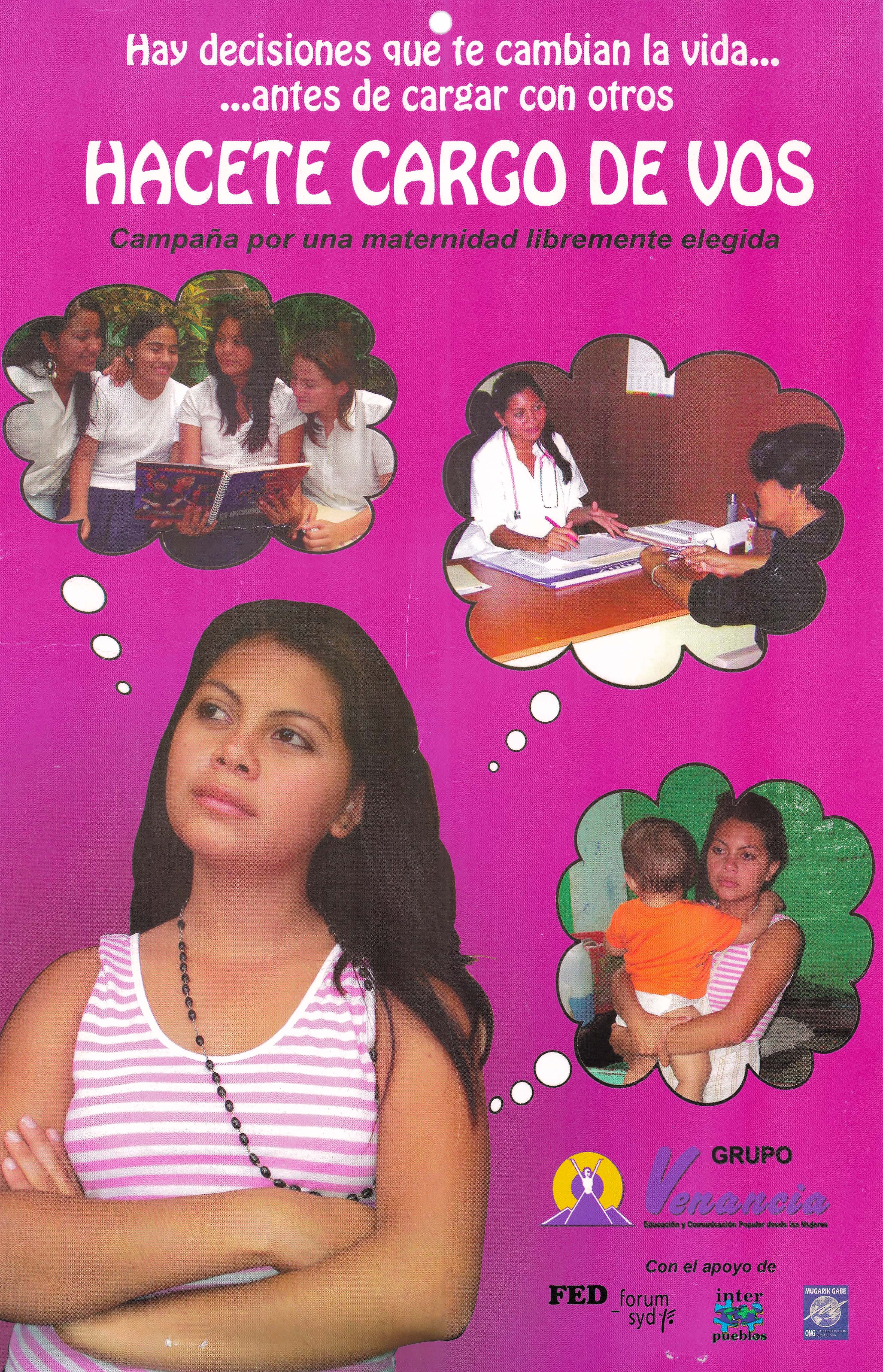 El cartel es parte de la campaña del Grupo Venancia de Nicaragua en defensa de la maternidad libremente elegida. El cartel muestra una imagen de una mujer pensativa y los pensamientos que salen de ella: educación, trabajo y maternidad. El lema es el siguiente: Hay decisiones que te cambian la vida… antes de cargar con otros Hacete cargo de Vos.