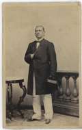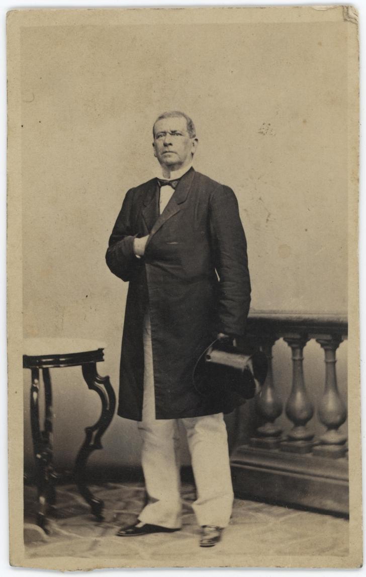 • Contenido: Retrato de estudio en plano entero de un hombre vestido con una levita y la chistera en la mano junto a una mesa y una barandilla con balaustres.