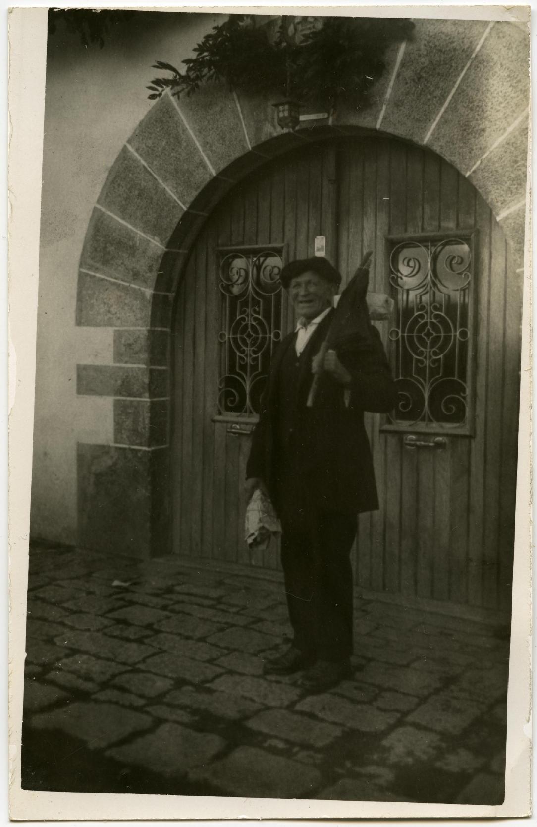 • Título: Hombre con paraguas en la puerta de Osanbela Txiki en la localidad de Huici, municipio de Larraun en Navarra.