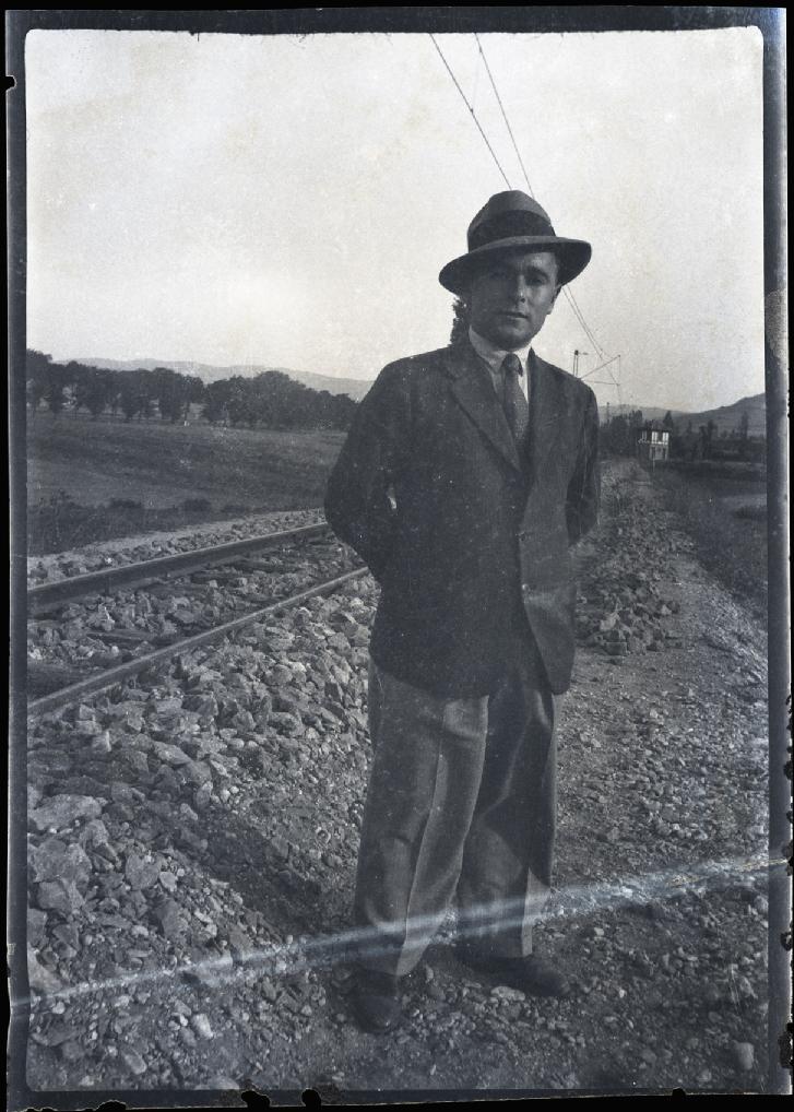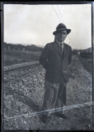 • Contenido: Retrato en plano entero de un hombre contraje y sombrero en un campo junto a las vías del tren.