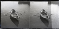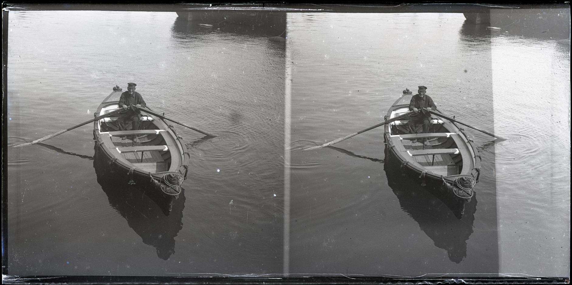 • Contenido: Retrato de un hombre sentado en una barca remando junto a un puerto. En el remo, grabadas, las letras, JABAD.