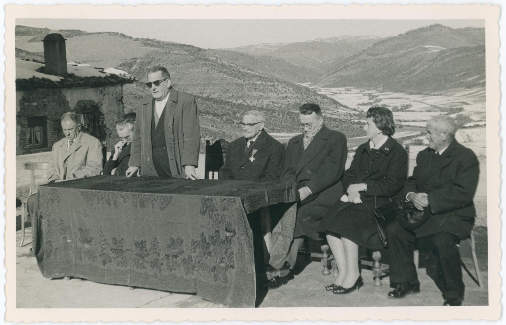 Vista de la mesa presidencial del homenaje del ayuntamiento de Navascués al maestro Jesús Lacasia Redín celebrado en la localidad de Aspuz. De pie, el diputado foral Amadeo Marco hablando al público.