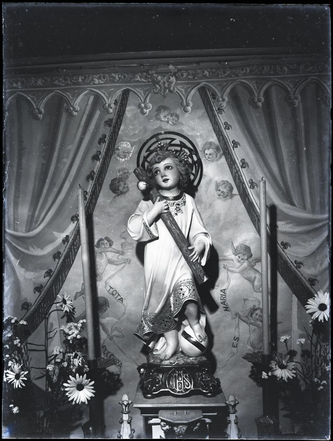 • Contenido: Vista frontal de una imagen del Niño Jesús con una cruz. De fondo, una pintura mural con ángeles.