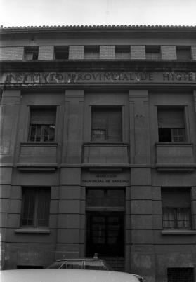 Vista parcial de la fachada del edificio del Instituto de Salud Pública de Navarra (antiguo Instituto Provincial de Higiene o Instituto Provincial de Sanidad) en la calle Leyre de Pamplona. En la fachada, el rótulo: INSTITUTO PROVINCIAL DE HIGIE(NE). Sobre la puerta, otro rótulo: INSPECCIÓN PROVINCIAL DE SANIDAD.