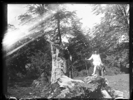 • Contenido: Retrato en plano entero de Jenara Altadill Aldave con un palo junto a un árbol caído en el campo.