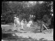 Retrato en plano entero de un grupo de 5 mujeres jóvenes sentadas sobre una valla en el campo. La primera de la izquierda, Jenara Altadill Aldave, la tercera, su hermana María Josefa.