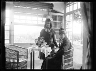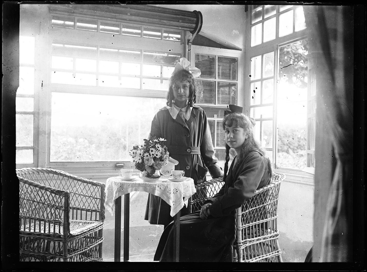 Retrato en plano americano de Jenara, en pie, y María Josefa Altadill Aldave, sentada, junto a una mesa con servicios de café en la galería de la casa de recreo familiar situada en el paraje de La Magdalena en Pamplona.