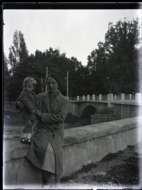 Retrato en plano americano de José Luis Azparren Aguinaga, de pie, con su tía sobre un muro junto al puente de San Andrés, sobre el río Ulzama, en la localidad de Villava, Navarra.
