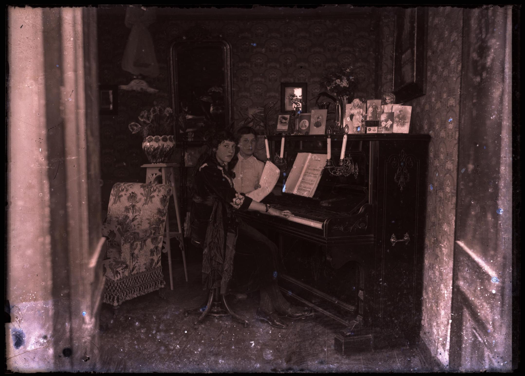 Vista de 2 mujeres jóvenes sentada junto a un piano en el salón de una casa. Una de ellas sujeta una partitura mientras toca las teclas con la mano derecha. Sobre el piano, fotografías y objetos decorativos. Al fondo, sobre el papel pintado, un espejo con copete.