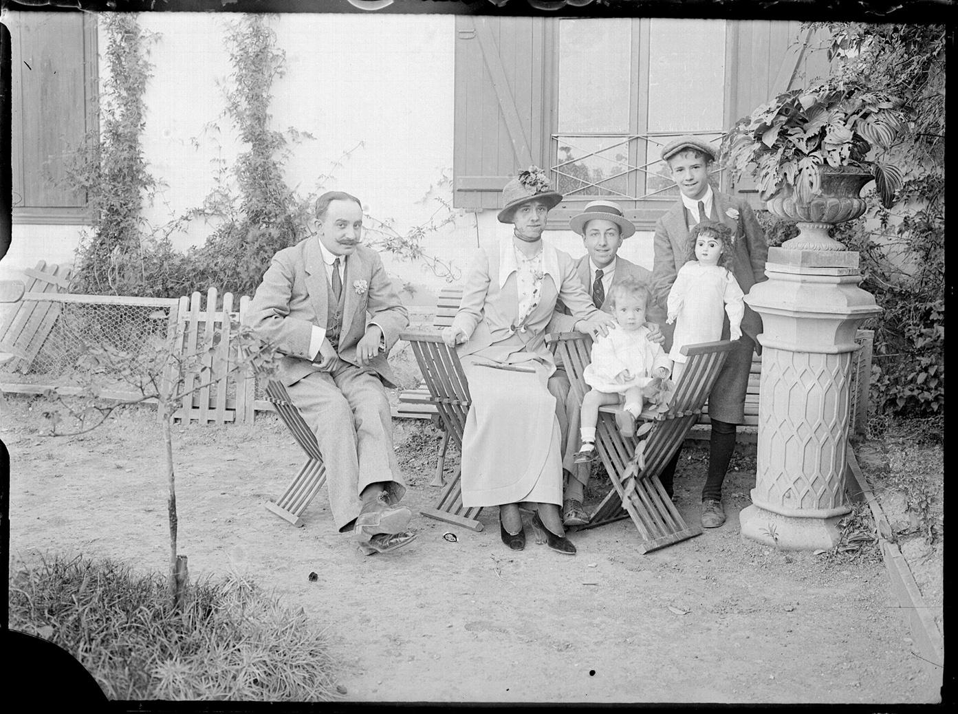 Retrato colectivo de los hermanos Juana María, Manuel y Francisco Altadill Aldave junto a su hermana pequeña María del Carmen, sentada sobre una silla, acompañados por Miguel Berazaluce Elcarte (primero por la izquierda), en el jardín de "Garden House", la casa de recreo de la familia Altadill Aldave situada en el paraje de La Magdalena en Pamplona.