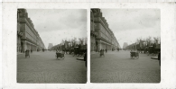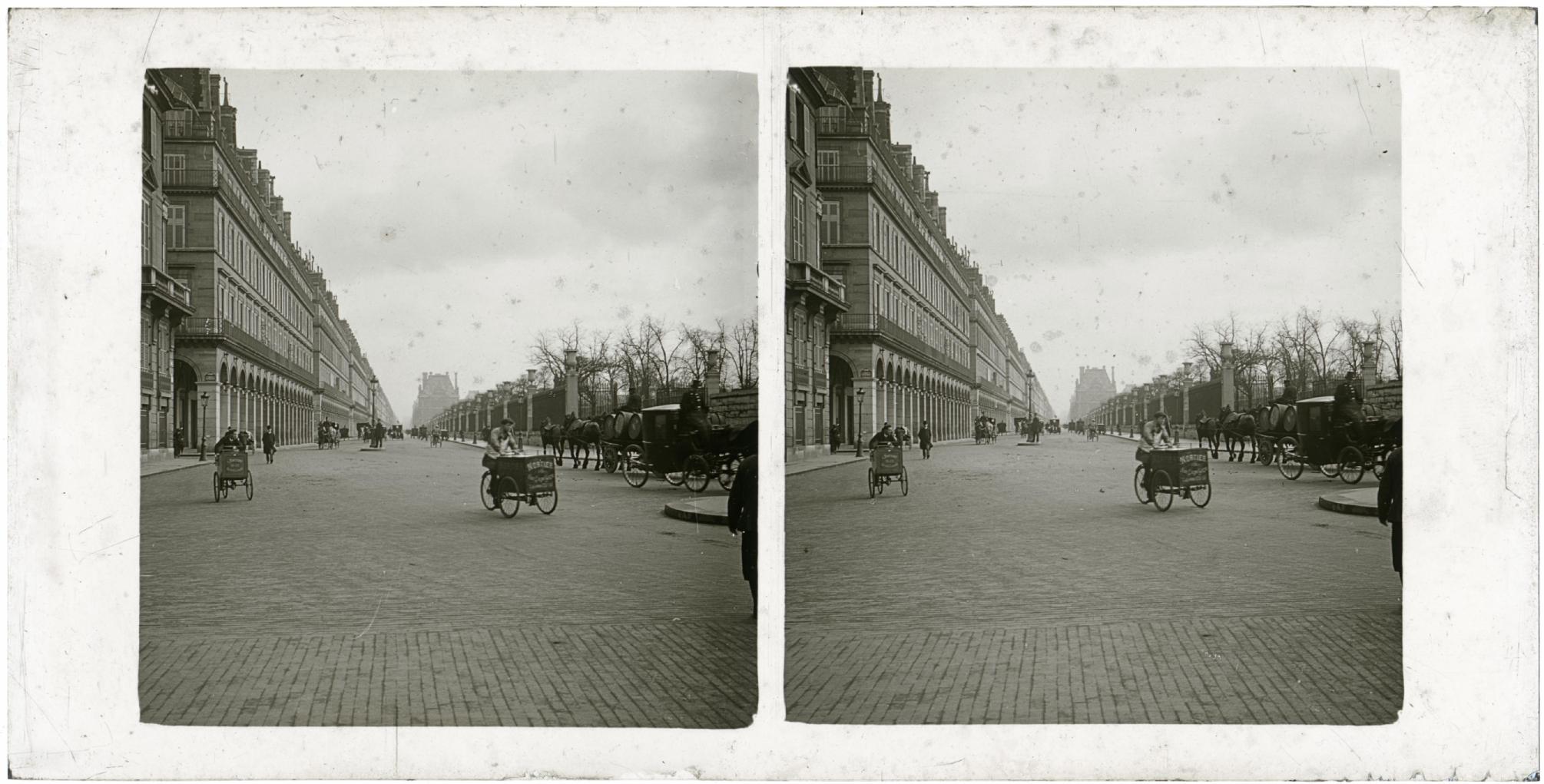 Vista de la calle Rívoli de París, tomada desde el oeste en el actual número 254. En primer término, la calzada con 2 triciclos de reparto. En segundo término, en la izquierda, el cruce con la calle Mondovi y, en la derecha, los jardines de las Tullerías. Al fondo, el palacio de Louvre. En la calle, diferentes carruajes tirados por caballos, uno de ellos con toneles.