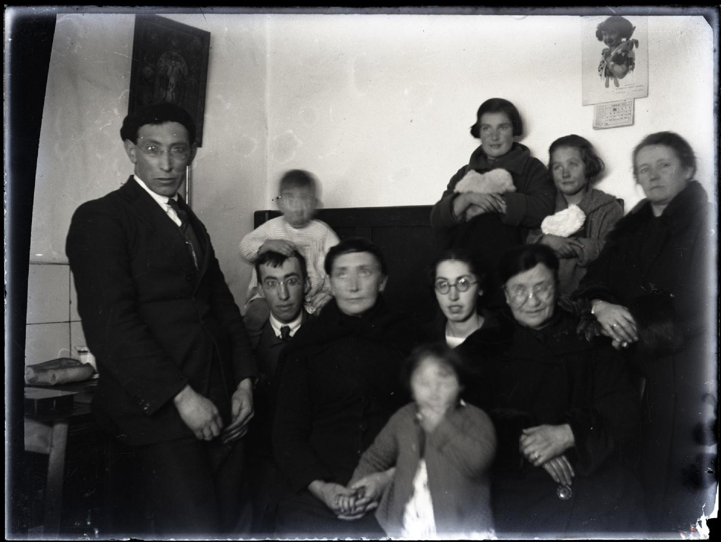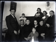 Retrato en plano americano de parte de la familia Azparren Orrio compuesto por 2 hombres, 4 mujeres y 4 niños en una habitación con una imagen religiosa y un calendario en la pared. El primero de la izquierda, Rufino Azparren Orrio y, junto a él, su hermano Pedro. En el centro, con gafas, Pilar Azparren Orrio.