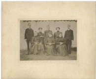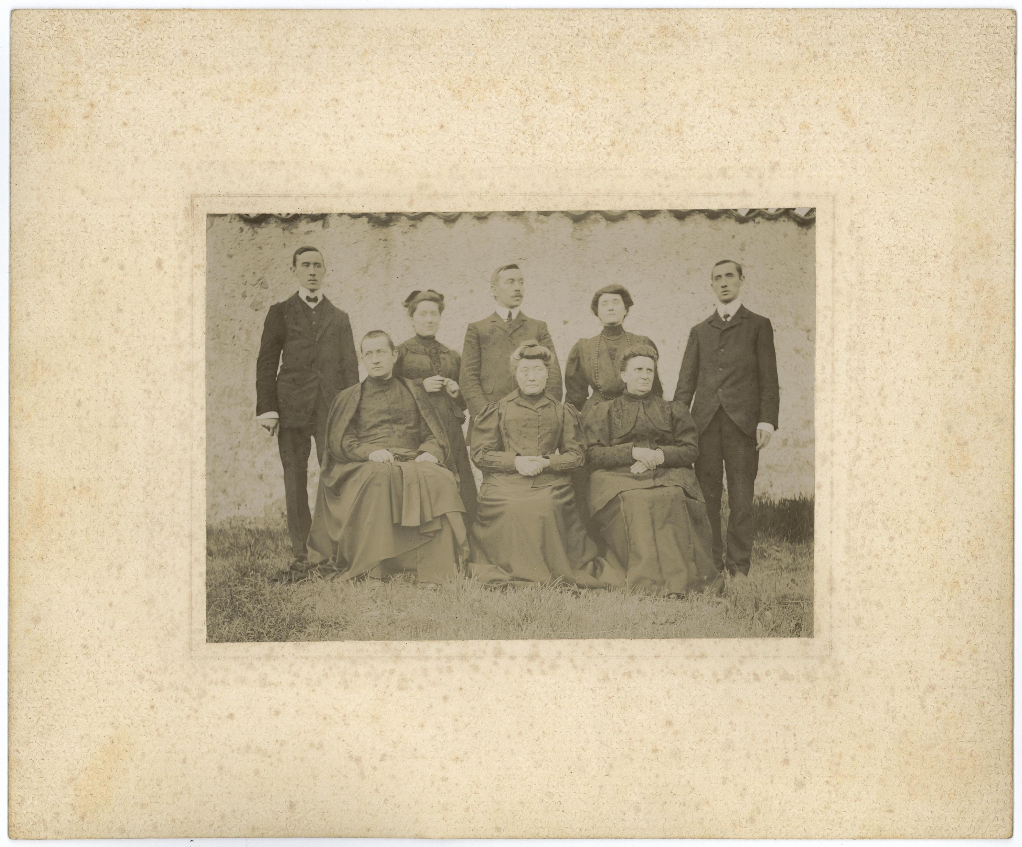 Retrato en plano entero de la familia Iraizoz Gastesi, compuesta por 4 hombres y 4 mujeres, delante de un muro. En el centro de la segunda fila, Francisco Iraizoz Gastesi.