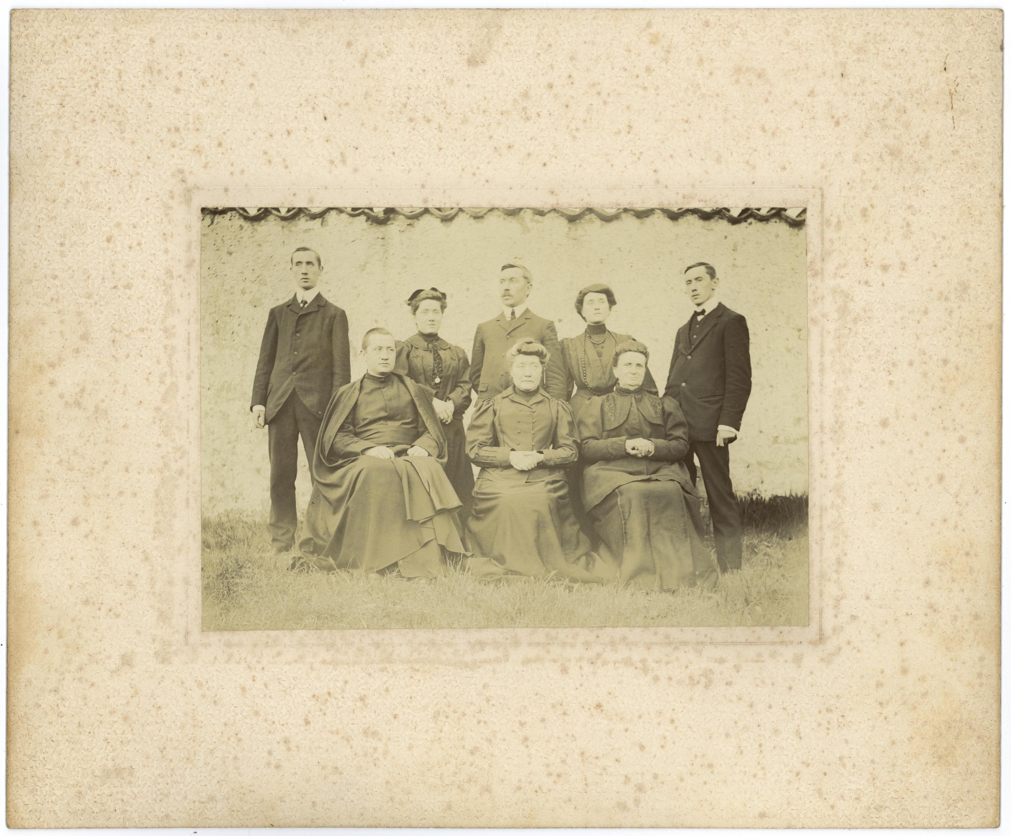 Retrato en plano entero de la familia Iraizoz Gastesi, compuesta por 4 hombres y 4 mujeres, delante de un muro. En el centro de la segunda fila, Francisco Iraizoz Gastesi.