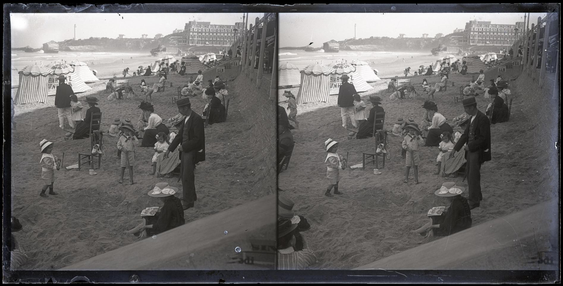 Vista de la playa de Biarritz tomada junto al casino. En primer término, un hombre jugando con unos niños con la arena. En segundo plano, señoras y niños sentados en sillas sobre la arena y sombrillas. Al fondo, el Hôtel du Palais y, en la izquierda, el faro.