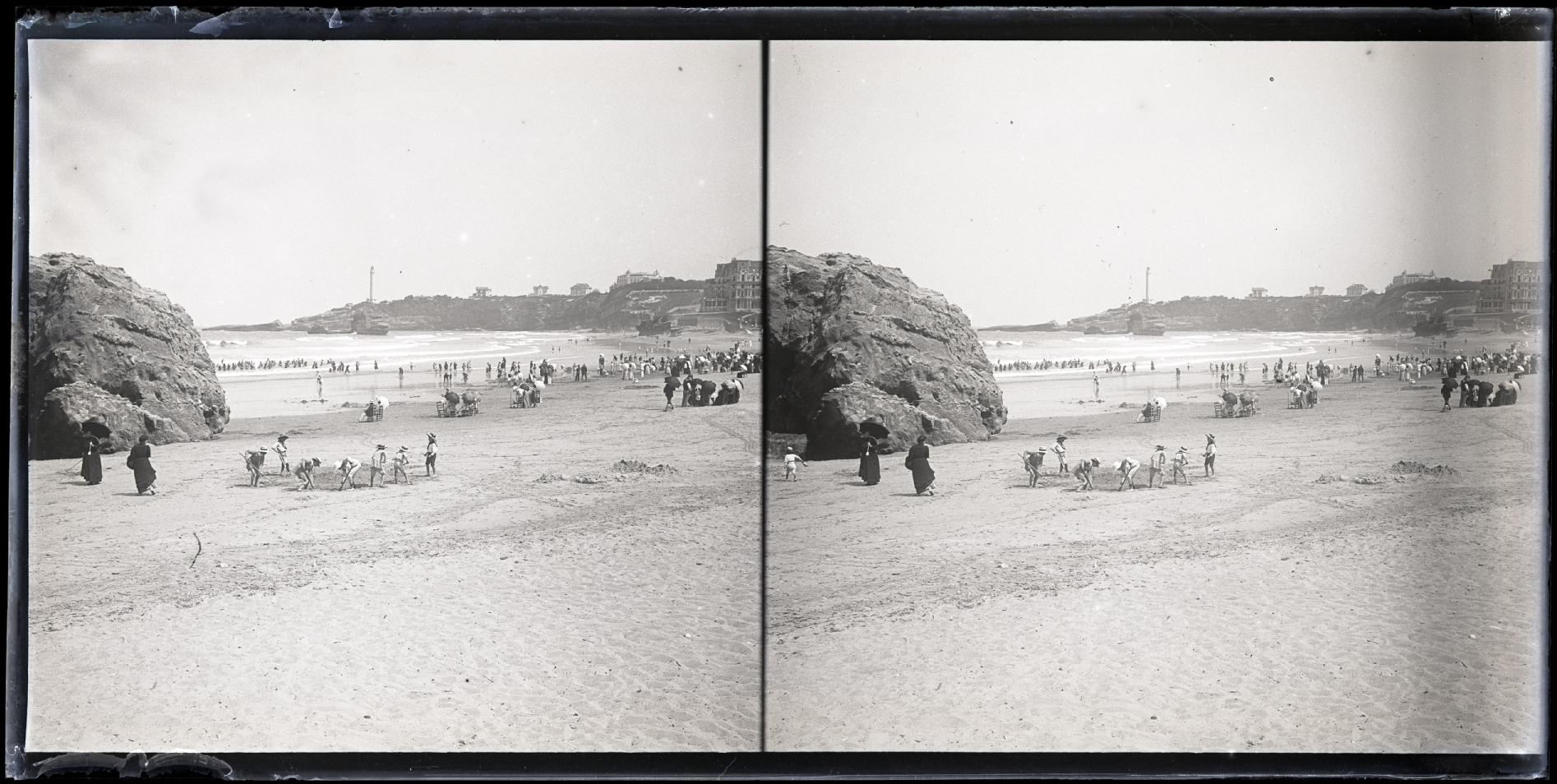 • Contenido: Vista de la playa de Biarritz, departamento de Pirineos Atlánticos, tomada desde el suroeste. En primer término, la playa. Al fondo, el Hôtel du Palais y, en la izquierda, el faro.