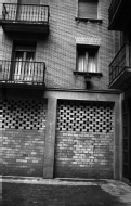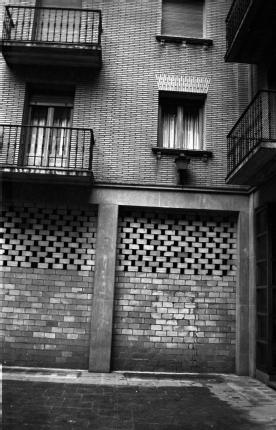 Vista exterior parcial del local de la planta baja en la calle Ansoleaga, 1 2- 14, de Pamplona evaluado para almacén de suministros del Gobierno de Navarra, fachada en la plaza de Comptos Reales.