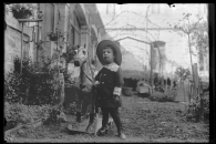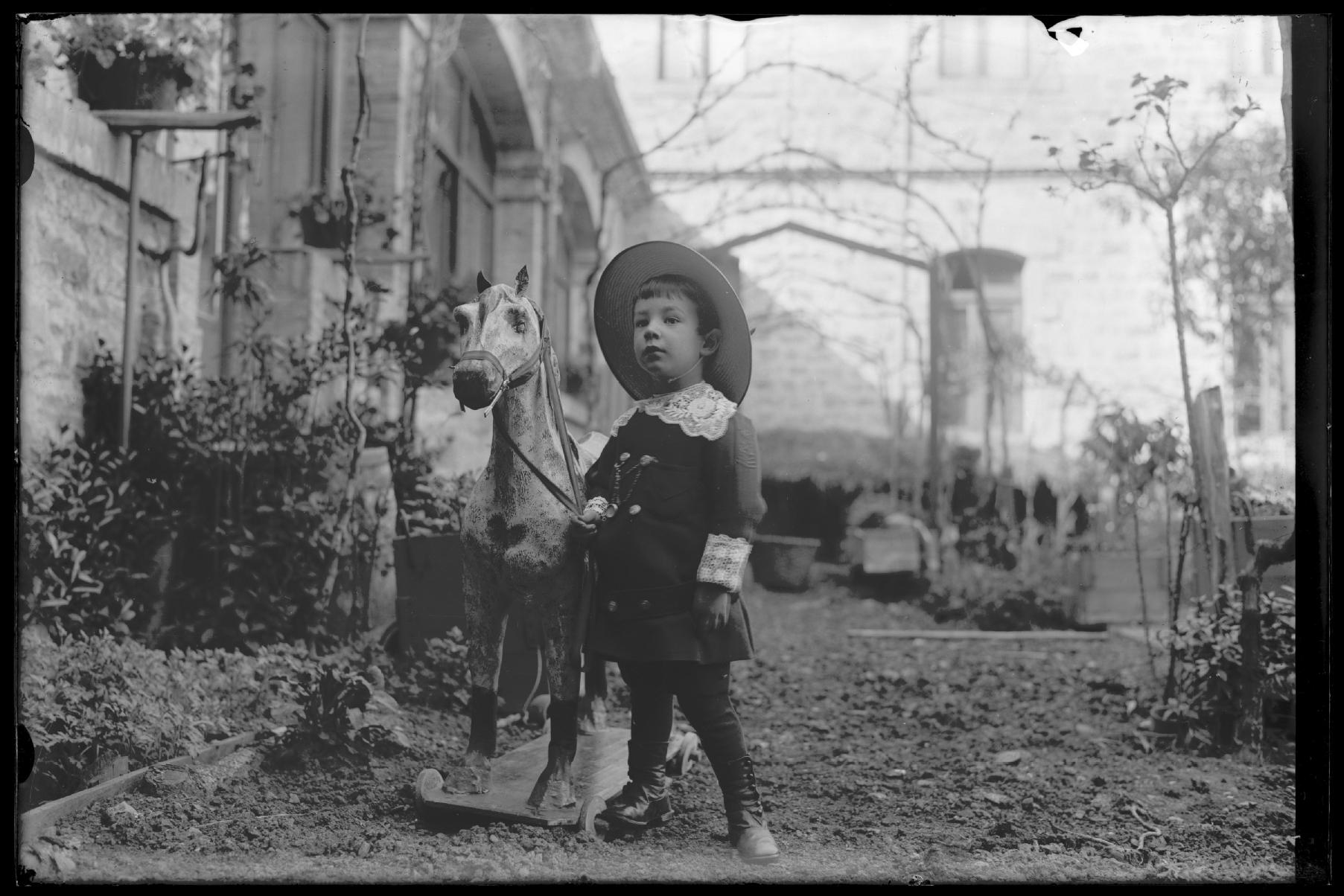 Retrato en plano entero de Luis, hijo de José Martínez Berasáin y Ramona Erro, con sombrero junto a un caballo de cartón en el patio del Hospital Psiquiátrico de Pamplona.