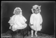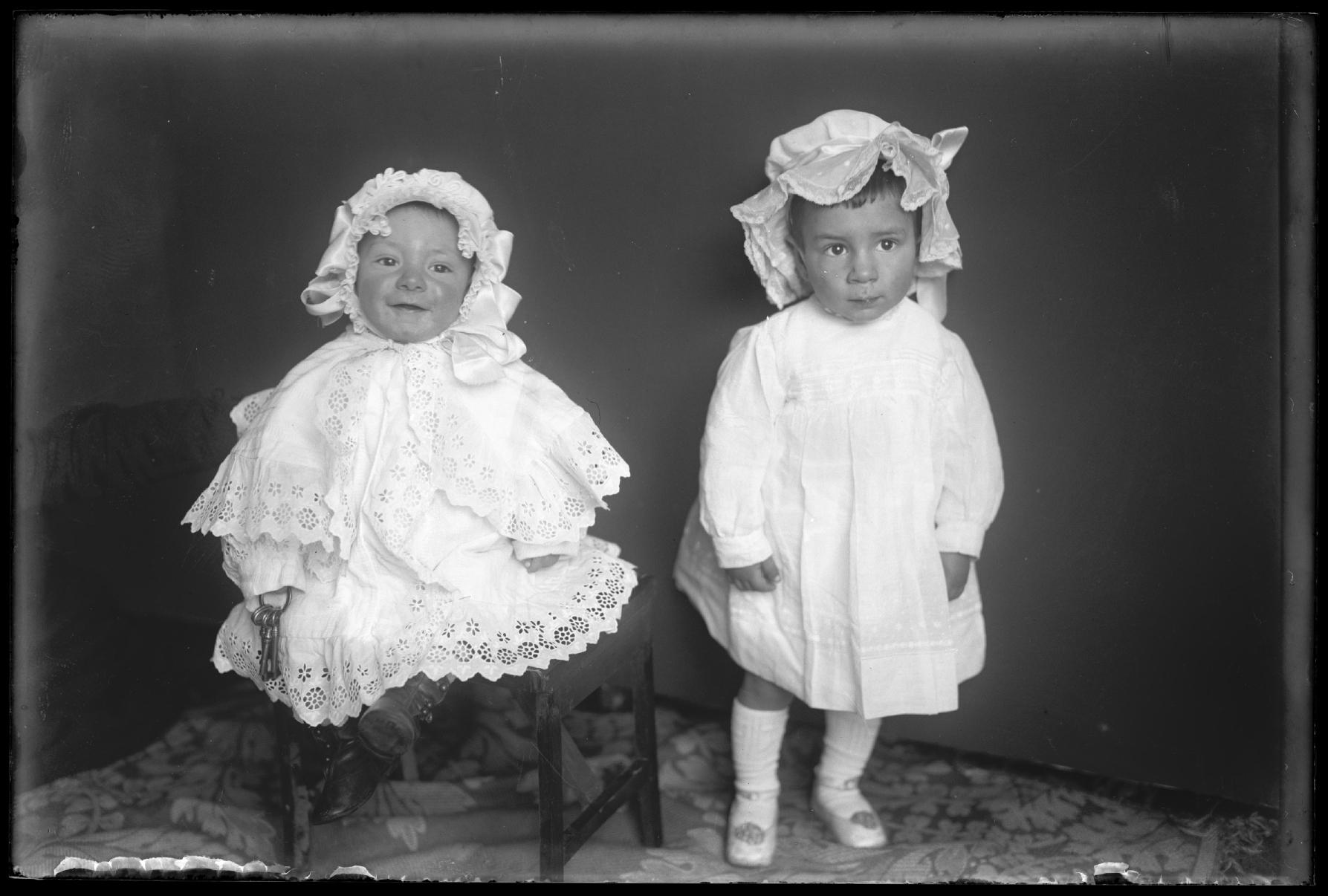 Retrato en plano entero de Luis y Margarita, hijos de José Martínez Berasáin y Ramona Erro Cia. La niña, sentada con unas llaves en la mano. El niño, de pie.