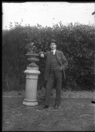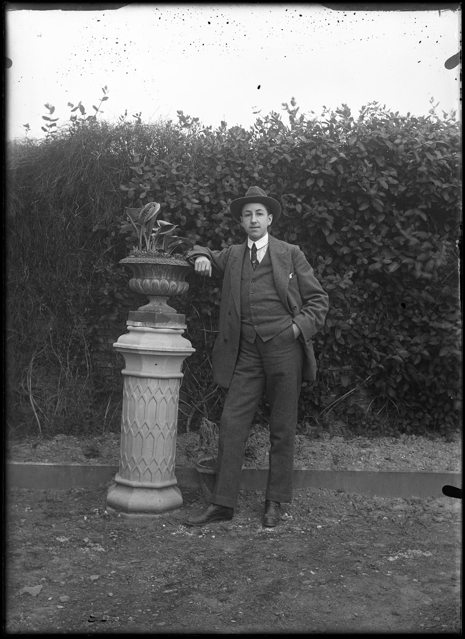Retrato frontal en plano entero de Manuel Altadill Aldave tomado en el jardín de "Garden House", la casa de recreo familiar situada en el paraje de La Magdalena en Pamplona. En el centro, Manuel joven, con traje y gorra, posa apoyado sobre un pilar con un jarrón floral.