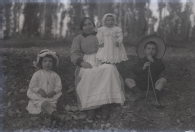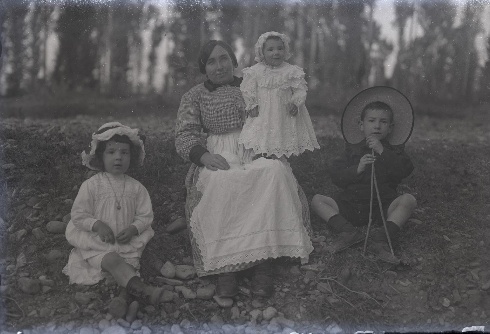 Retrato de los hijos de José Martínez Berasáin y Ramona Erro con la niñera. De izquierda a derecha, sentados en el campo, Margarita, la niñera con Mercedes de pie en su regazo y Luis.