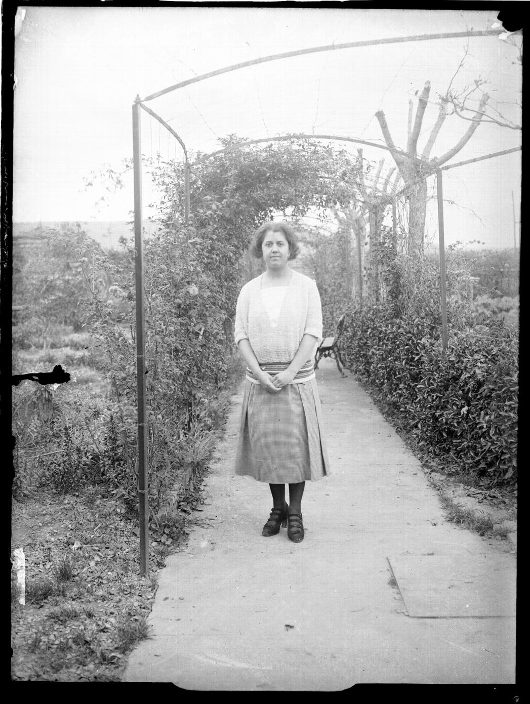 Retrato frontal en plano entero de María Altadill Aldave en pie en el jardín de "Garden House", la casa de recreo familiar situada en el paraje de La Magdalena en Pamplona.