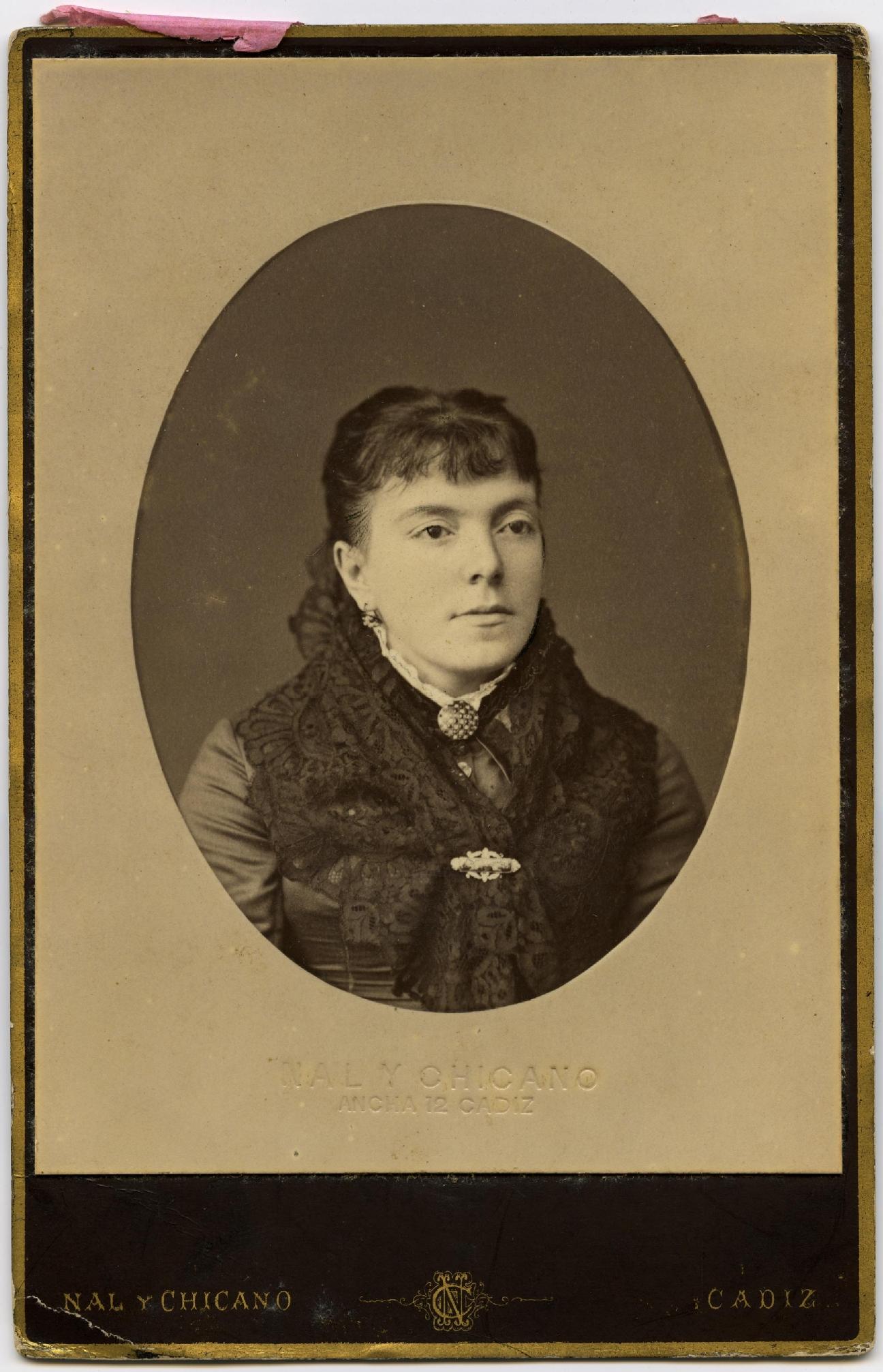 En el soporte secundario marcas impresas del establecimiento fotográfico: NAL Y CHICANO. ANCHA 12 CADIZ / NAL Y CHICANO CADIZ. En el reverso: MEDALLA DE ORO. Fotografía francesa y española. NAL Y CHICANO. Calle Ancha, Nº 12. CADIZ. El estudio fotográfico Nal y Chicano. Fotografía Francesa y Española trabajó bajo esta denominación en la calle Ancha, nº 12 entre 1864 y 1884. Restos del papel de seda de protección en la parte superior.